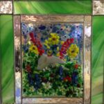 During the first class, you will create a 6″ X 8″ fused glass panel. During the second class, you will select and cut a combination of stained glass and bevels to frame out your fused panel using copper foil stained glass techniques. Previous experience cutting and soldering stained glass is required. The course fee includes fusing glass, kiln firing, bevelled glass, stained glass, solder and came required to complete your project.